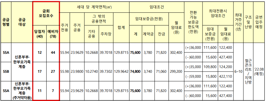 모두 55형이 나왔으면 A타입과 B타입으로 되어있습니다. 당첨자 중 총 40세대는 바로 입주, 그 외 78세대는 예비자가되어 입주를 기다리게 됩니다.