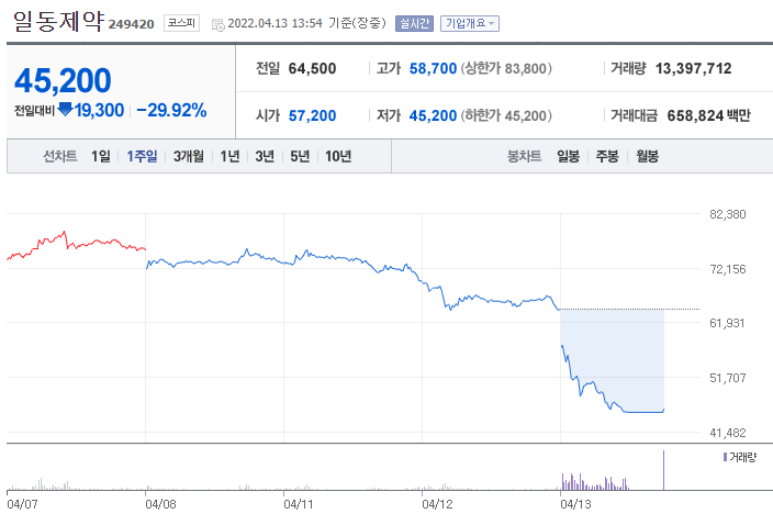 일동제약이 오늘 오후 12시즘부터 계속해서 하한가를 찍고 있는 모습입니다.