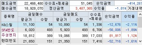 처음 종목 선정에서 주성엔지니어링으로 많이 수익을 봤는데 욕심에 더 더 매매해보자는 생각을 갖다보니 원칙을 못 지키게되고, 더 손실이 커지는 것 같다.