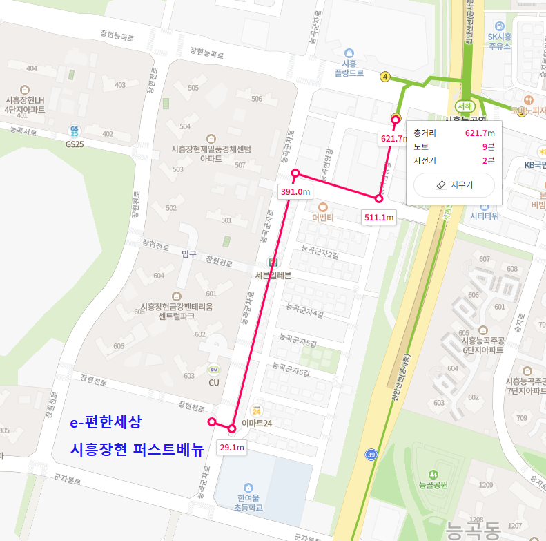 네이버 지도 기준으로 단지 끝에서 도보로 약 10분정도면 시흥능곡역 3번출구에 갈 수 있습니다. 의무 거주 기간과 전매제한이 있어서 당첨된다면 아이의 초등학교는 바로 붙어있어서 좋습니다. 한여울 초등학교 내 병설 유치원도 이용할 수 있구요. (물론 당첨되는 전제 하에..)