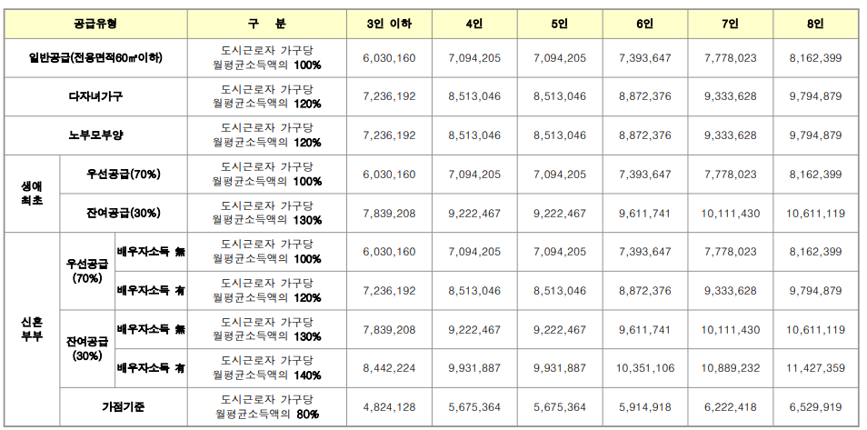 올해 공공분양 했던 파주운정3 A16블록의 입주자 모집 공고 기준으로 소득 기준은 아래와 같습니다.